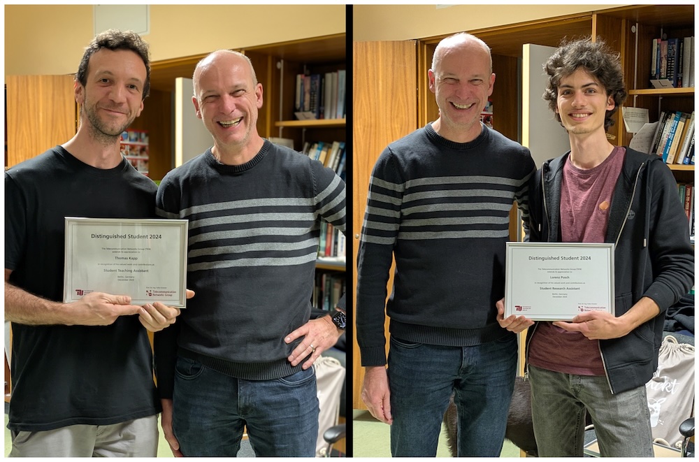 We congratulate Jakob Rühlow and Lorenzo Imöhl von Flocken for receiving this year's Distinguished Student award at TKN! With the the award, we recognize their valued work and contributions as Student Research Assistant and Student Teaching Assistant, respectively.