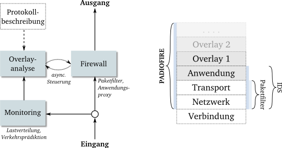 Ziel des Projekts PADIOFIRE ist es, ein neuartiges Firewallsystem zu entwickeln, welches eine semantische Analyse von mehrfach geschachtelten Anwendungsprotokollen am Beispiel von Web 2.0-Diensten durchführen kann. Die Ergebnisse der Analyse stellen die Grundlage für die Entscheidung dar, ob zugehörige Datenströme weitergeleitet oder verworfen werden. Konkret ist es geplant, ein Intrusion Detection System (IDS) als Basis zu nutzen, welches auf die Erkennung von bestimmten Strukturen, vorrangig Angriffen, im Netzwerkverkehr spezialisiert ist und somit gut geeignet für die Anwendungs- und Protokollerkennung ist. Da aktuelle IDS-Ansätze nicht auf die semantische Analyse von Overlaystrukturen spezialisiert sind, welche für eine genaue Analyse auf Anwendungsebene nötig ist, soll eine neuartige Regelsprache entwickelt werden, welche mehrfach geschachtelte Anwendungsprotokolle detailliert analysiert. Die semantische Analyse von Anwendungsdaten ist sehr aufwändig, daher sind architektonische Optimierungen geplant. Zum einen spielt die verteilte Analyse auf mehreren Prozessorkernen eine essentielle Rolle und zum anderen ist die Entwicklung einer losen Kopplung von Analyse und Firewall geplant.